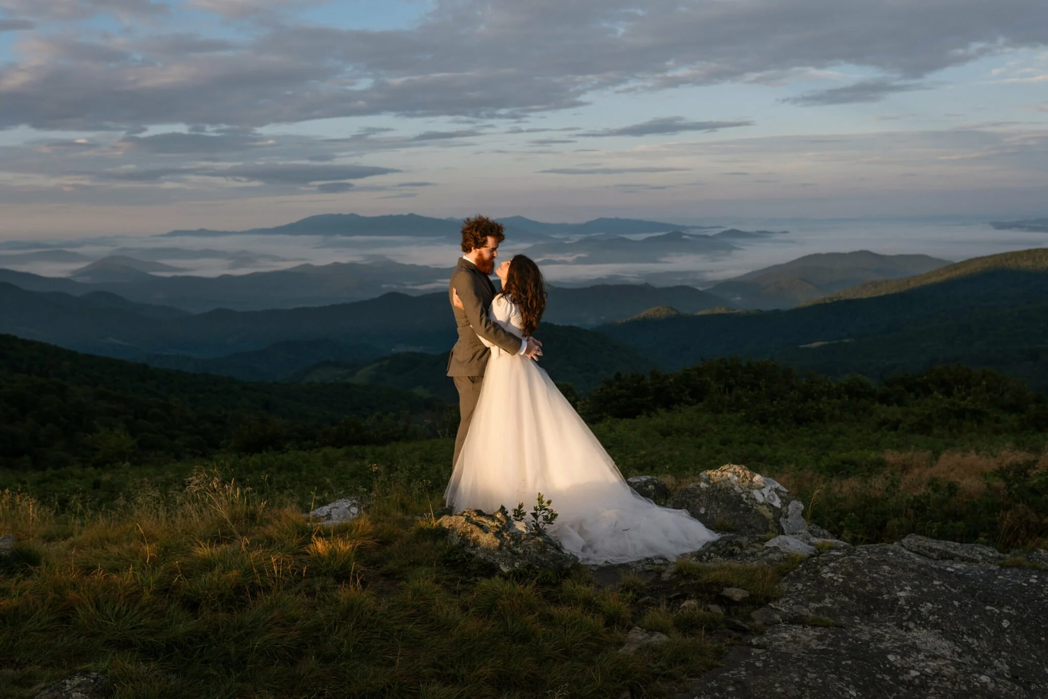 When it was time for their vows, I told Jess and Colin to find a spot that felt right—a place they could settle into, feel grounded, and take it all in. They wandered just a bit before picking a quiet little overlook, with the mountains stretching out behind them and the first golden light of day still warming the ridge.